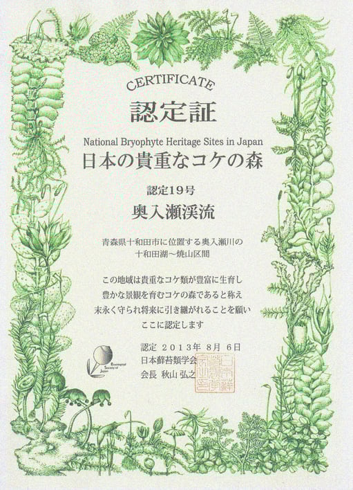 奥入瀬渓流には300種類以上のコケ植物が生息しています。環境の変化に敏感なコケが豊かであるということ。それは自然の純度と安定度が高いということでもあります。2013年、奥入瀬は日本蘚苔類学会によって、19番目の「日本の貴重なコケの森」に選定されました。蘚苔類の豊富な地域のうちでも、とりわけ貴重で重要なエリアがこの指定を受けています。コケという奥入瀬の多様な価値の一面が、より多くの人たちに理解されることが期待されています。