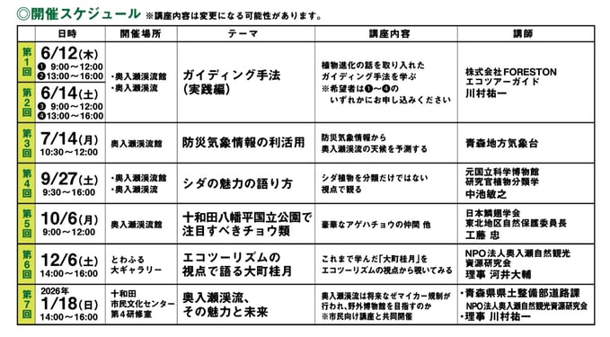 奥入瀬野外博物館構想(奥入瀬フィールドミュージアム)の実現に向け、奥入瀬渓流の魅力と価値を伝え、お客様とその感動を共有するエコツアーガイドの役割は非常に重要です。奥入瀬渓流のゴールデンコースと言われる(石ヶ戸~雲井の滝)をガイドできるようになることをゴールに、自然の知識やガイドスキルを学ぶ講座です。